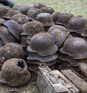 Sensationeller Fund in Brandenburg: Dutzende deutsche Soldatenhelme und zahlreiche Waffen aus dem Zweiten Weltkrieg tief im Boden entdeckt.H