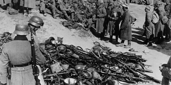Im April 1941 wurde Jugoslawien innerhalb weniger Tage zum Schauplatz eines raschen militärischen Zusammenbruchs. Das bekannte Foto zeigt deutsche Soldaten, die Waffen und Ausrüstung von kapitulierten jugoslawischen Truppen einsammeln. Zwei der Männer auf der linken Seite tragen Uniformen, die darauf…
