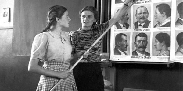 Deutsche Schüler nehmen 1943 am Rassenaufklärungsunterricht teil. Die drei auf dem Plakat abgebildeten Gruppen sind (von oben nach unten) die „ostbaltische Rasse“, die „ostische Rasse“ und die „dinarische Rasse“. Alle drei Gruppen wurden zu den Unterrassen der kaukasischen Rasse gezählt,…