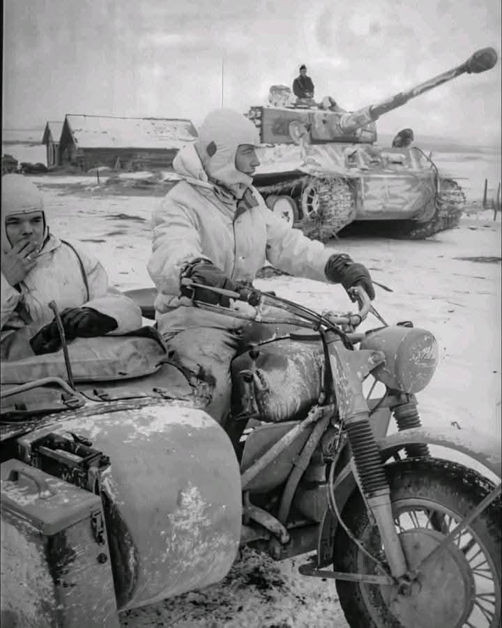 Der Winter war einer der erbarmungslosesten Feinde, denen Soldaten im Zweiten Weltkrieg gegenüberstanden. Auf diesem historischen Foto sieht man eine Szene, die den Alltag an der Ostfront symbolisiert: deutsche Soldaten in dicken weißen Tarnanzügen, eine schwere BMW-Maschine mit Beiwagen im…
