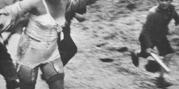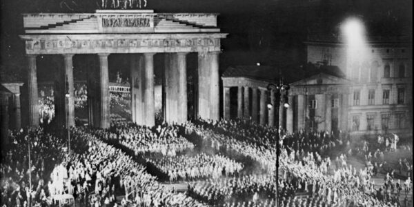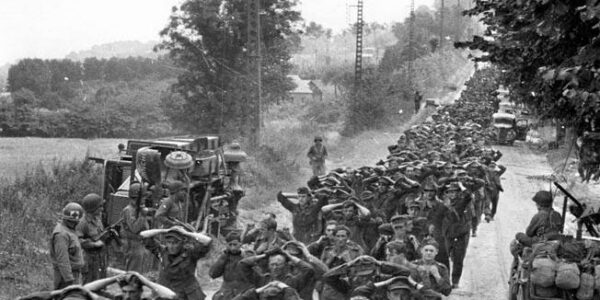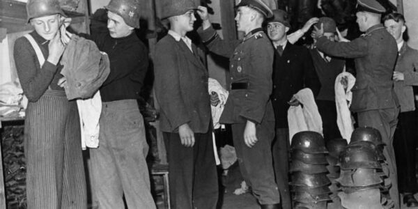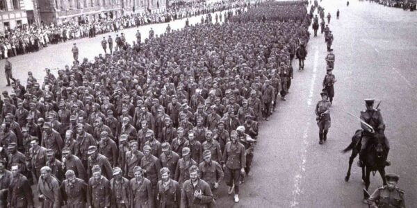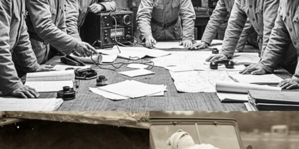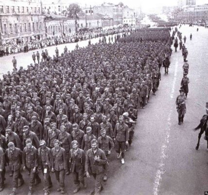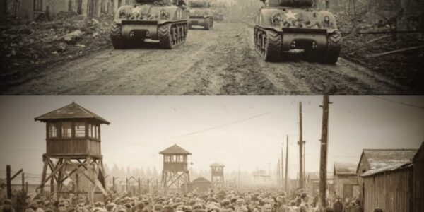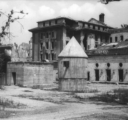 Das Foto zeigt keinen heroischen Vormarsch und keinen glorreichen Sieg. Es zeigt das Ende. Ein schwerer deutscher Panzer bewegt sich langsam durch eine Straße, die kaum noch als solche zu erkennen ist. Um ihn herum ragen ausgebrannte Hausfassaden in den…