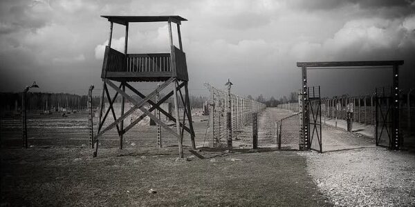Der Himmel ist schwer und dunkel, die Wolken türmen sich wie drohende Mauern, und ein fahles Licht fällt über das leere, von Schienen durchzogene Gelände. Das Bild zeigt den Eingang zu einem der berüchtigtsten Orte des 20. Jahrhunderts: das Vernichtungslager…