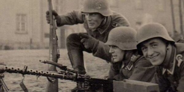 Auf dem Foto deutsche Soldaten neben einem MG-34 Maschinengewehr während einer militärischen Ausbildung (1940). Deutsche Soldaten marschieren über ein Feld während der ersten Monate der Operation Barbarossa (1941). Man kann erkennen, dass sie Uniformen des Modells M-36 und M-40…