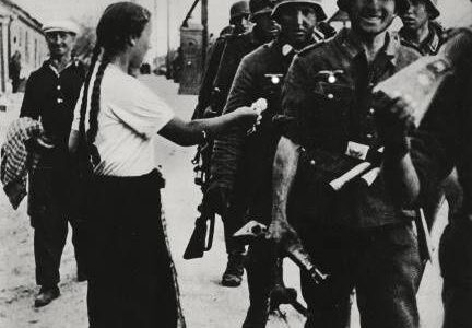 Auf dem Foto: Deutsche Soldaten werden 1942 von der litauischen Bevölkerung mit Blumen empfangen.Man sieht, dass ein Soldat ein MG-34-Maschinengewehr auf der Schulter trägt. Auf dem Foto: Der deutsche Soldat Fritz Reidel kehrt am 21. Mai 1945 zu seiner Ehefrau…