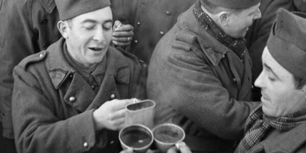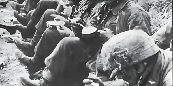 Der Schlamm klebt an ihren Stiefeln, die Uniformen sind verschmutzt, die Gesichter erschöpft – und doch halten sie inne, für einen kurzen Moment des Menschseins. Das Foto, aufgenommen im Herbst 1944 irgendwo an der Westfront, zeigt deutsche Fallschirmjäger, die auf…
