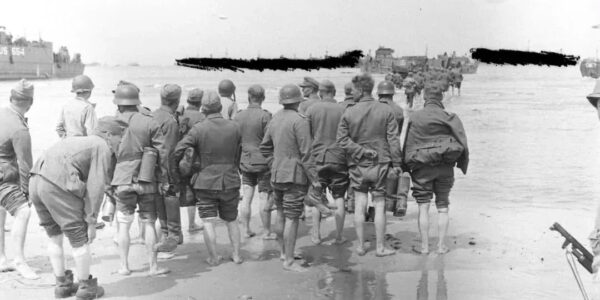 Normandie 1944: Kriegsgefangene oder Badegäste? – Ein seltenes Foto zeigt deutsche Soldaten bei der Evakuierung, fast wie beim Planschen.H