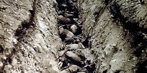 Die Westfront im Ersten Weltkrieg – ein Ort, der heute sinnbildlich für die Grausamkeit, Ausweglosigkeit und Unmenschlichkeit des modernen Krieges steht. Dieses seltene Foto zeigt einen deutschen Schützengraben, vermutlich unmittelbar nach einem Gasangriff. Die Landschaft ist karg, die Luft…