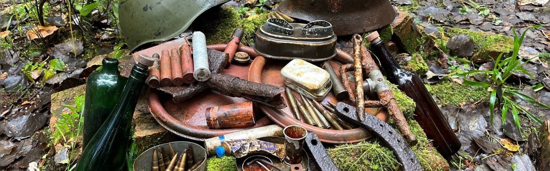 Zu den gefundenen Objekten gehören mehrere Stahlhelme, leere und teilweise gefüllte Munitionshülsen, Patronen, Feldflaschen, Metallteile sowie persönliche Gebrauchsgegenstände. Die Anordnung der Fundstücke deutet darauf hin, dass es sich nicht um eine zufällige Ansammlung handelt, sondern um einen Ort, an dem sich deutsche Soldaten während der Kriegsjahre aufgehalten haben könnten – möglicherweise ein provisorischer Unterstand oder ein kurzfristig genutzter Sammelpunkt.