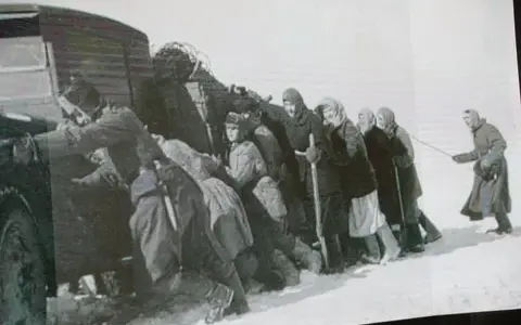 C M3-4 minutes Der Zweite Weltkrieg brachte unzählige menschliche Tragödien mit sich – nicht nur auf den Schlachtfeldern, sondern auch weit davon entfernt, in Dörfern, Städten und auf eisigen Wegen wie dem hier gezeigten. Das Foto dokumentiert einen der dramatischsten…