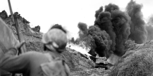 Der Zweite Weltkrieg brachte unzählige Bilder des Grauens hervor, doch nur wenige wirken so eindringlich wie diese Szene von der Ostfront. Rauchschwaden steigen in den grauen Himmel, während ein deutscher Soldat im Vordergrund den brennenden Panzer beobachtet. Die Luft ist…