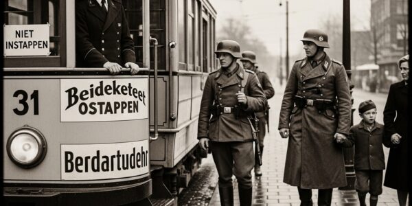 Besetztes Stadtleben 1940er: Straßenbahn unter Kontrolle deutscher Soldaten – Ein Moment zwischen Alltag und Besatzung.H