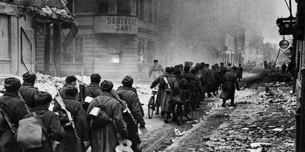 Das hier gezeigte Farbfoto stammt aus den letzten Wochen des Zweiten Weltkriegs, aufgenommen im Frühjahr 1945 in der völlig zerstörten deutschen Hauptstadt Berlin. Es zeigt deutsche Soldaten, vermutlich Wehrmacht-Angehörige, die sich durch die Ruinen einer Stadt bewegen, die unter dem…