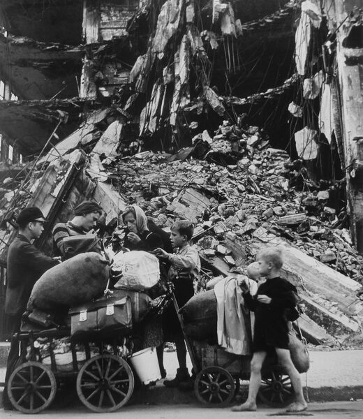 Im Sommer 1945 liegt Berlin in Trümmern. Die Stadt, einst ein Symbol für deutsche Kultur, Wissenschaft und Moderne, ist nur noch ein Schatten ihrer selbst. Bombenangriffe haben ganze Stadtteile ausgelöscht, Häuser sind eingestürzt, Straßen sind von Schutt und Ruinen bedeckt. Inmitten dieses apokalyptischen Bildes sieht man eine Familie – bestehend aus Frauen, Kindern und älteren Menschen – mit zwei Handwagen, voll bepackt mit Habseligkeiten, auf der Suche nach einem neuen Anfang.