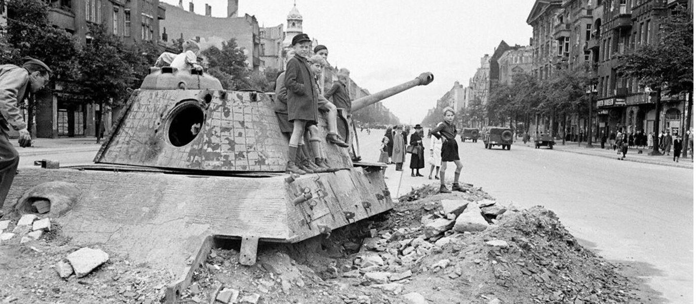 Der Krieg war vorbei, doch der Frieden fühlte sich für viele Berlinerinnen und Berliner noch weit entfernt an. Die Straßen lagen in Schutt und Asche, Häuser waren zerbombt, Brücken zerstört – und dennoch begann das Leben langsam wieder, sich zu regen. Dieses Foto, aufgenommen im Sommer 1945, zeigt einen Moment zwischen Vergangenheit und Zukunft: Kinder spielen auf den Resten eines zerstörten Panzers, während ein alliiertes Fahrzeug an der Ecke einer schwer beschädigten Straße vorbeifährt. Im Hintergrund erhebt sich die Fassade einer zerschossenen Deutsche Bank – ein Symbol für ein Land, das wirtschaftlich und moralisch am Boden lag.