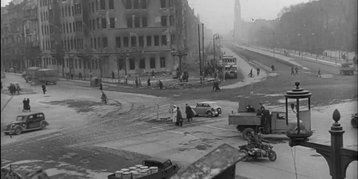 Das Foto wurde offenbar im Bereich der „Knie“ aufgenommen – ein historischer Knotenpunkt in Berlin, der heute dem Ernst-Reuter-Platz entspricht. Die Gebäude stehen noch, der Verkehr fließt, als wäre alles normal. Doch wer genau hinschaut, erkennt erste Anzeichen von Chaos: beschädigte Fassaden, überladene Fahrräder, hektische Blicke.