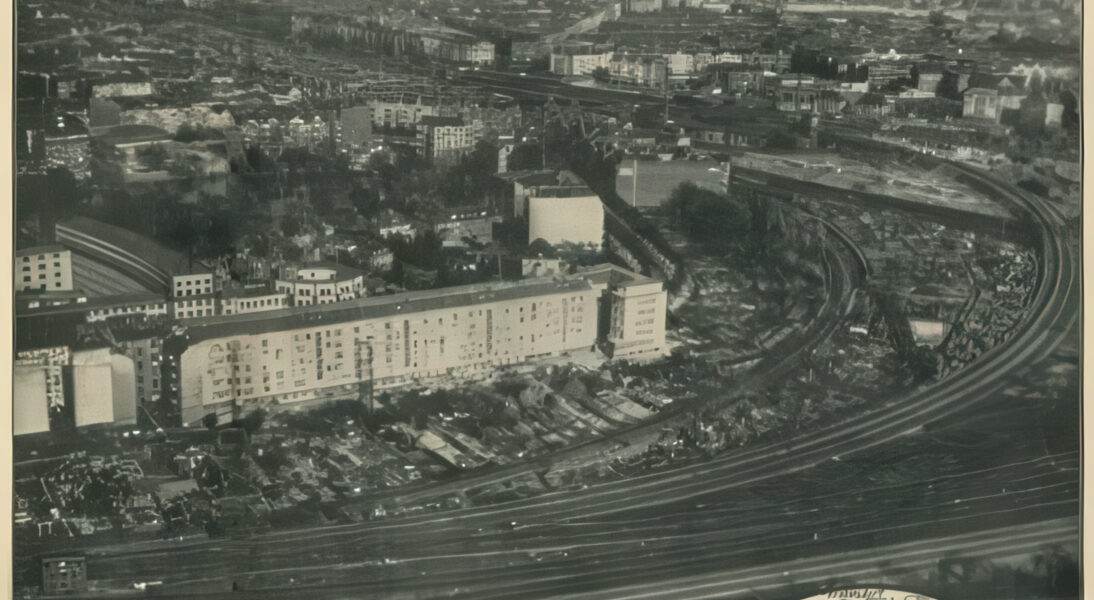 Großflächige Wohnbauten dominieren Teile der Aufnahme. Sie stehen für den Versuch, Wohnraum effizient und in großer Zahl bereitzustellen. Nach Zeiten massiver Zerstörung und Wohnungsnot war der Bau solcher Anlagen eine Antwort auf dringende soziale Bedürfnisse. Aus der Luft betrachtet erscheinen diese Gebäude streng geometrisch, fast anonym. Doch hinter jeder Fassade verbargen sich individuelle Lebensgeschichten, Hoffnungen und der Wunsch nach Stabilität.
