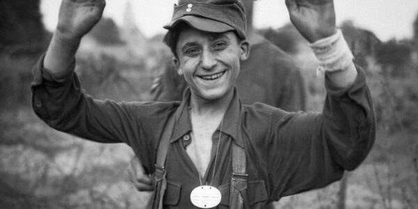 Ein Moment zwischen Angst und Erleichterung – warum dieser junge deutsche Soldat nach seiner Gefangennahme im Sommer 1944 plötzlich lächelt.H