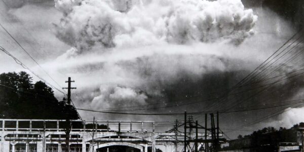 Der aufsteigende Atompilz über Nagasaki, wenige Minuten nach der Detonation der Atombombe, 9. August 1945. Aufnahme von Koyagi-jima, 8 Kilometer vom Zentrum Nagasakis entfernt. Dies ist vermutlich das früheste Foto vom Boden aus, 15 Minuten nach der Detonation der Plutoniumbombe…