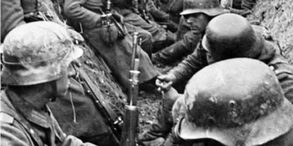 Ein Moment Menschlichkeit im Chaos des Krieges – Deutsche Soldaten ruhen in einem Schützengraben, Ostfront 1944.H