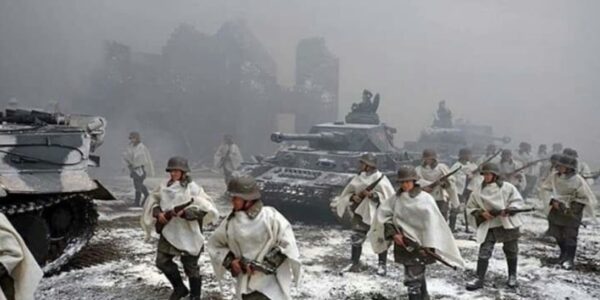 Der Winter an der Ostfront gehört zu den eindrucksvollsten und zugleich erschütterndsten Kapiteln des Zweiten Weltkriegs. Das Bild zeigt deutsche Soldaten in weißen Tarnüberwürfen, die sich zwischen Panzern und zerstörten Gebäuden ihren Weg durch Schnee und Rauch bahnen. Die Szene…