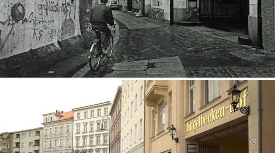 Berlin ist eine Stadt, die in jeder Mauer, jedem Stein und jeder Straße ihre Geschichte atmet. Das Bild oben zeigt eine eindrucksvolle „Damals-und-heute“-Perspektive: dieselbe Straße, derselbe Blickwinkel, doch zwei vollkommen verschiedene Welten. Auf dem oberen Bild radelt ein Mann an der Berliner Mauer entlang, vorbei an grauen, unfreundlichen Fassaden, die das geteilte Berlin so prägnant widerspiegeln. Es ist ein Moment, der das Gefühl von Überwachung, Kontrolle und Trennung einfängt, wie es Millionen Berliner über Jahrzehnte erlebt haben.