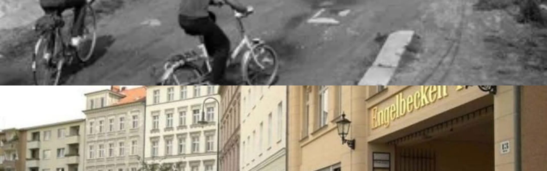 Der Engelbecken-Hof, der hier zu sehen ist, lag direkt an der Grenze zwischen Ost- und West-Berlin. Heute wirkt die Straße freundlich, einladend, ruhig – fast unscheinbar. Auf dem aktuellen Bild radelt derselbe Mensch (oder symbolisch jemand an derselben Stelle) über die gleiche Kopfsteinpflasterstraße, aber ohne Mauer, ohne Kontrolltürme, ohne Soldaten mit Gewehren. Stattdessen geparkte Autos, blühende Bäume, neugestaltete Fassaden und ein offenes, freies Berlin.