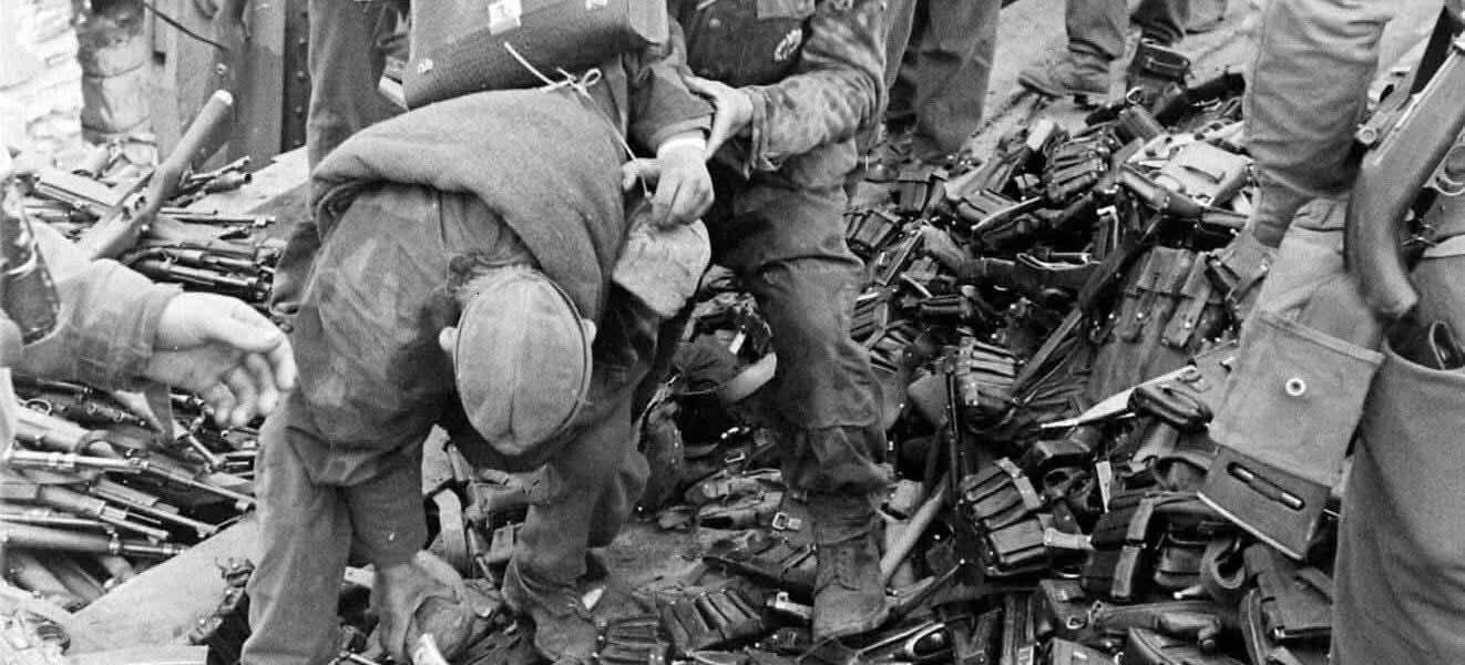 Man sieht Männer in zerrissenen Uniformen, die Hände schmutzig vom Dreck und Blut, die Augen leer, aber doch erleichtert. Zwischen ihnen liegen Hunderte von Gewehren, Pistolen und Helmen – ein Berg aus Metall, Symbol eines gescheiterten Wahnsinns. Jeder Gegenstand erzählt eine eigene Geschichte: ein Gewehr, das nie mehr abgefeuert wird, ein Helm, der seinen Träger vielleicht vor dem Tod bewahrt hat, ein Dolch, der nie benutzt wurde.