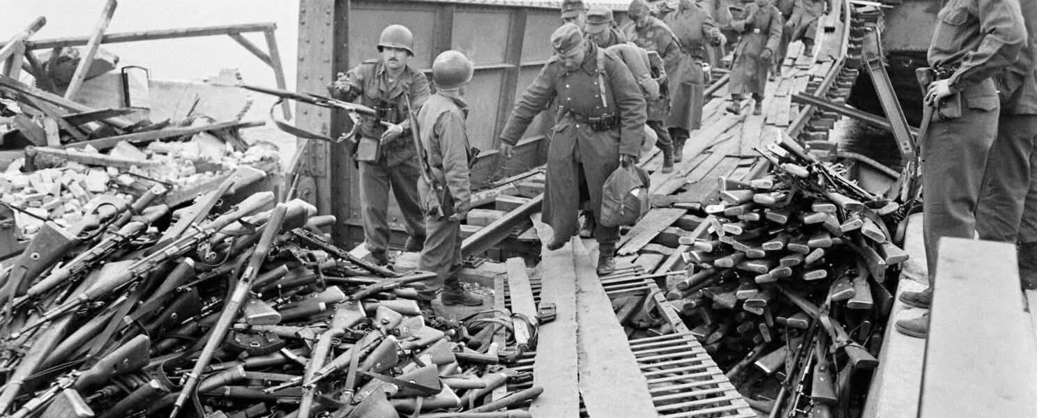 Man sieht Männer in zerrissenen Uniformen, die Hände schmutzig vom Dreck und Blut, die Augen leer, aber doch erleichtert. Zwischen ihnen liegen Hunderte von Gewehren, Pistolen und Helmen – ein Berg aus Metall, Symbol eines gescheiterten Wahnsinns. Jeder Gegenstand erzählt eine eigene Geschichte: ein Gewehr, das nie mehr abgefeuert wird, ein Helm, der seinen Träger vielleicht vor dem Tod bewahrt hat, ein Dolch, der nie benutzt wurde.