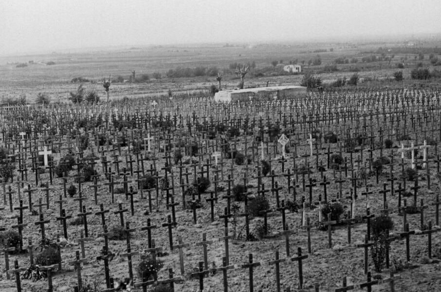 Was die Aufnahme besonders eindrucksvoll macht, ist nicht nur die schiere Zahl der Kreuze, sondern die Konsequenz, mit der sie das Bild dominieren. Es gibt keine zentrale Figur, keinen klaren Fokus – das gesamte Foto ist der Fokus. Die Masse überwältigt. Und gerade dadurch beginnt man zu begreifen, wie gigantisch der Verlust gewesen sein muss. Nicht einzelne Namen, sondern Tausende. Nicht einzelne Schicksale, sondern ein Meer aus fehlenden Stimmen.