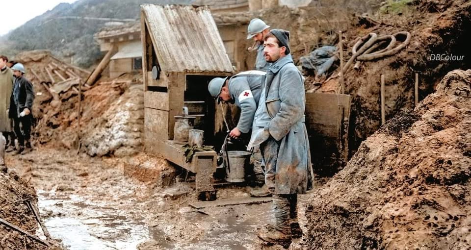 Des soldats français du 370e régiment d’infanterie mangent de la soupe pendant la bataille de l’Aisne.
