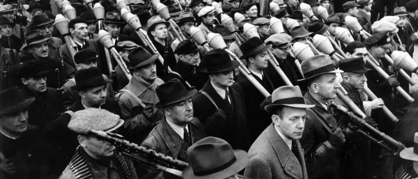 Sie tragen alte Uniformteile, manchmal nur Mäntel aus Zivilkleidung, und die Waffen, die sie halten, sind ein seltsames Sammelsurium: veraltete Gewehre aus dem Ersten Weltkrieg, italienische Karabiner, Panzerfäuste, ja sogar Jagdgewehre. Doch in ihren Gesichtern liegt mehr Verzweiflung als Entschlossenheit. Denn diese Männer sind keine Soldaten – sie sind das, was von einem erschöpften Land übrig blieb.