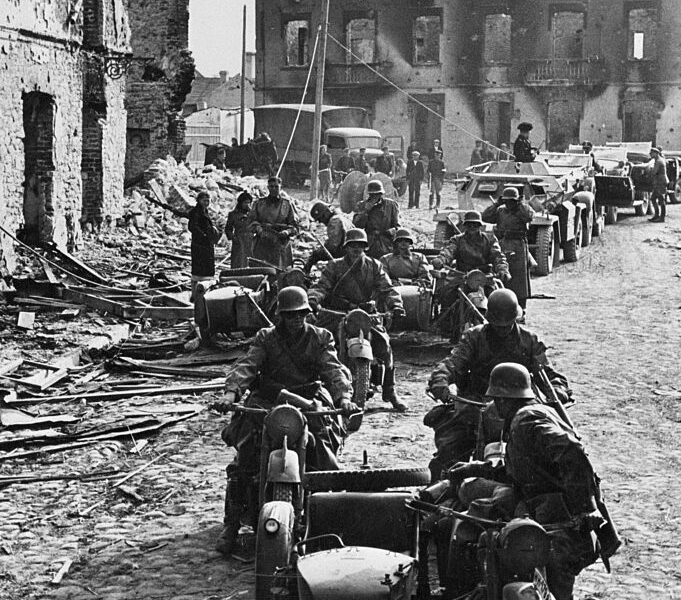 Das Foto zeigt auch etwas von der Disziplin und Organisation der Wehrmacht. Trotz der Trümmerlandschaft bewegen sich die Fahrzeuge geordnet, in einer klaren Kolonne. Solche Strukturen waren ein entscheidender Teil der deutschen Kriegsführung, die stark auf Effizienz, Koordination und das Zusammenspiel unterschiedlicher Waffengattungen setzte. Motorräder, Panzerwagen, Artillerie und Infanterie griffen ineinander, um den schnellen Vormarsch zu ermöglichen.