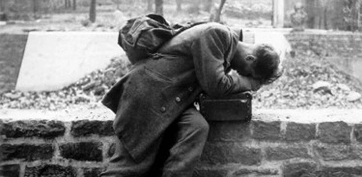 Für den Fotografen Tony Vaccaro sind Szenen der Verzweiflung kein Fremdwort. Er hielt den besiegten Mann in den Qualen seiner Trauer fest, während hinter ihm unheimlich die zerbombten Ruinen seiner ehemaligen Häuser aufragen.