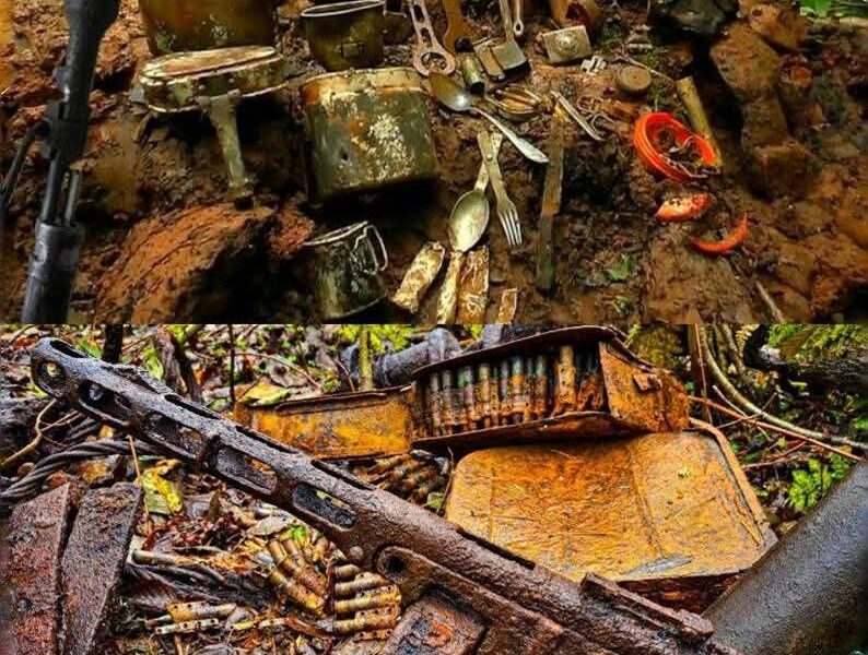 Die entdeckten Gegenstände sprechen eine klare Sprache. Neben einem stark korrodierten Gewehr finden sich Patronen, Metallkästen, Feldgeschirr, Besteck und Werkzeuge. Solche Kombinationen deuten darauf hin, dass hier nicht nur Waffen, sondern der Alltag eines Soldaten oder einer kleinen Einheit zurückgelassen wurde. Es ging nicht mehr um Gefechte, sondern ums Überleben.
