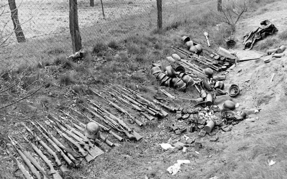 Deutschland 1945: Zurückgelassene Gewehre, Helme und Ausrüstung – stumme Zeugen der letzten Tage vor der Kapitulation.H
