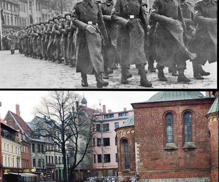 Die beiden Bilder, die wir hier nebeneinander sehen, könnten auf den ersten Blick nicht gegensätzlicher sein. Oben marschieren deutsche Soldaten in Reih und Glied durch eine historische Stadt, die Straßen gesäumt von Fahnen, die Gesichter ernst und vom Krieg gezeichnet. Unten zeigt sich derselbe Ort heute – ruhig, farbenfroh, voller alltäglicher Normalität. Wo einst Stiefel im Gleichschritt über das Kopfsteinpflaster donnerten, stehen heute Fahrräder. Wo einst Fahnen im Wind wehten, ragen heute friedlich die Mauern alter Häuser in den Himmel.