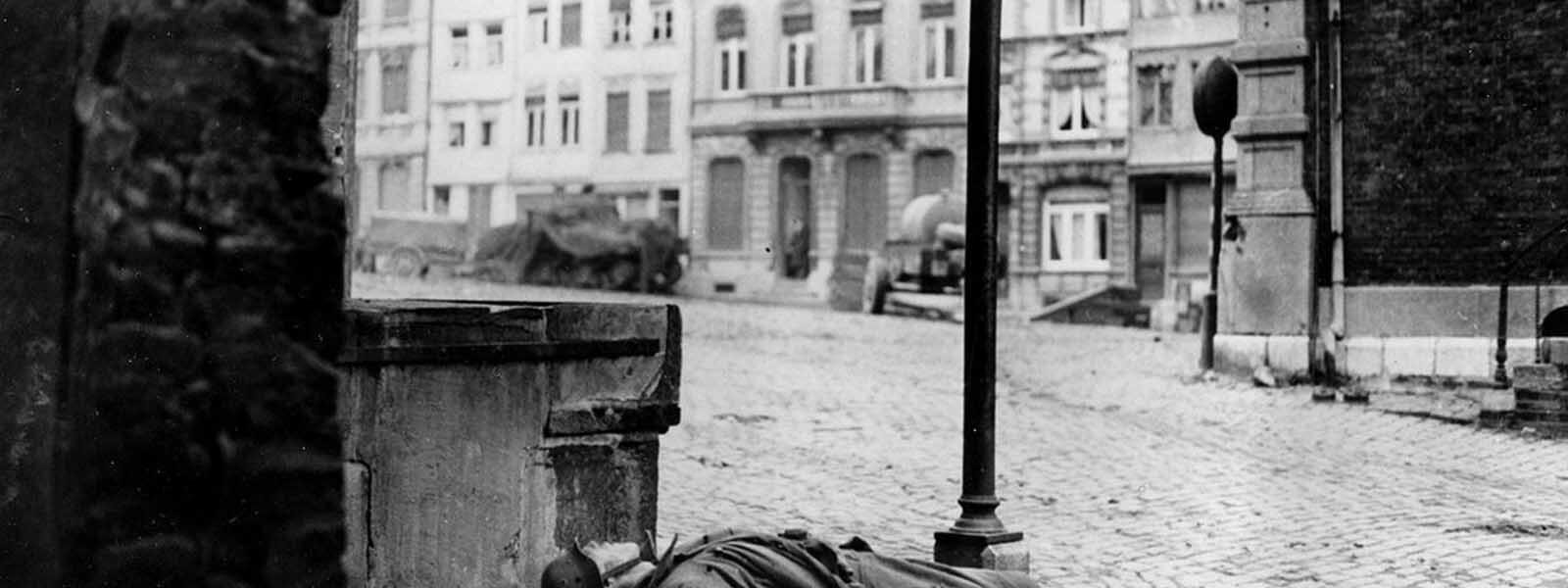 Ein toter deutscher Soldat, der während der deutschen Gegenoffensive im belgisch-luxemburgischen Frontbogen getötet wurde, wird am 2. Januar 1945 an einer Straßenecke im belgischen Stavelot zurückgelassen, während die Kämpfe in der Ardennenoffensive weitergehen.