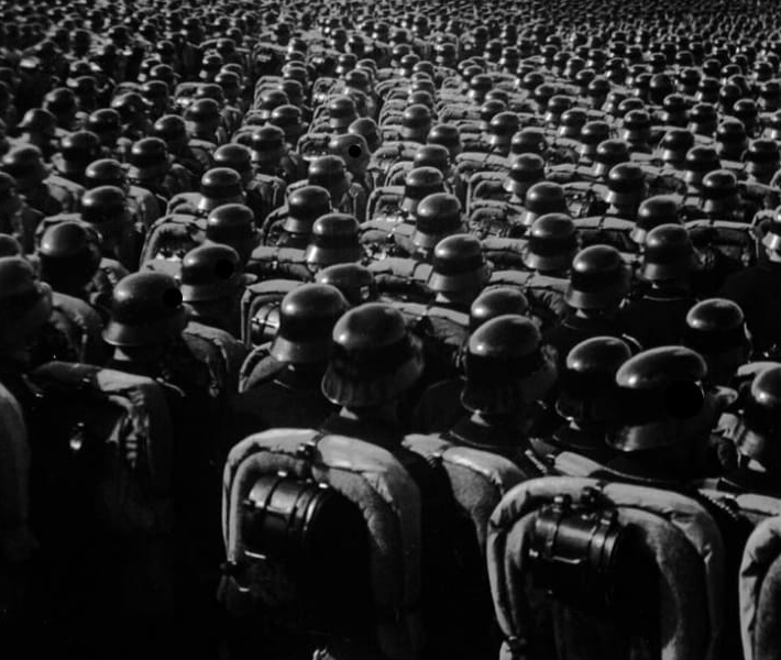 Das Foto zeigt, wie gefährlich Masse werden kann, wenn sie nicht hinterfragt. Wenn Verantwortung abgegeben wird. Wenn der Einzelne sich hinter der Reihe vor ihm versteckt. In dieser Formation trägt niemand allein Schuld – und genau darin liegt das Problem. Schuld wird verdünnt, verteilt, unsichtbar gemacht.