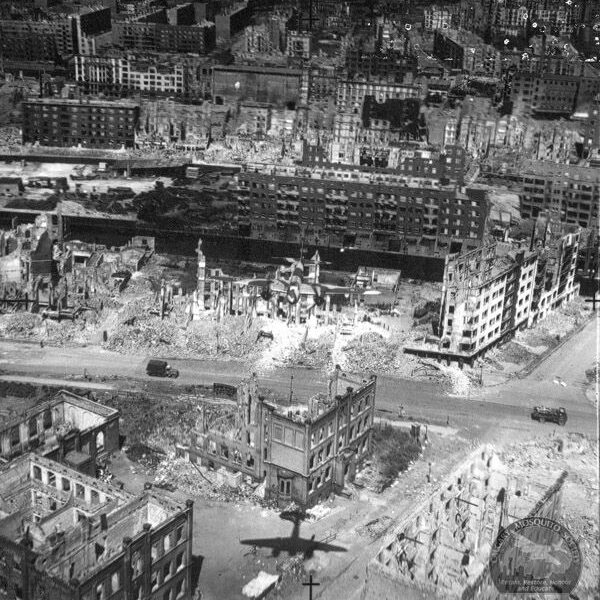 Dramatischer Blick auf Berlin: Zerstörung nach den alliierten Bombardierungen – und ein perfekt getarnter Mosquito im Zentrum des Fotos.H
