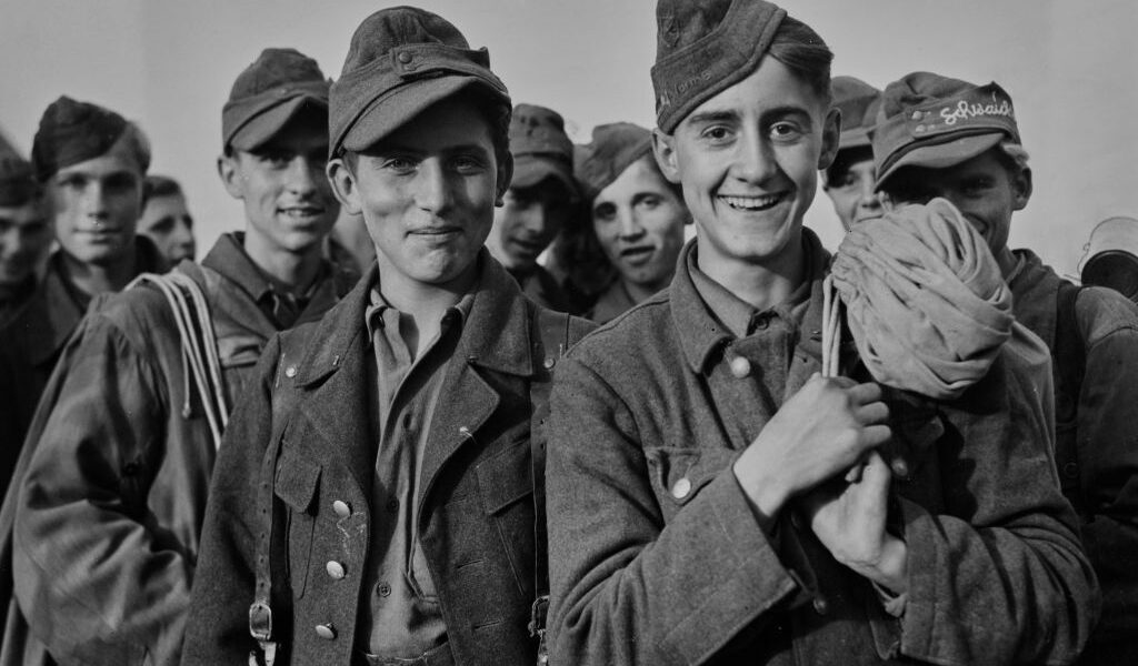 Im Frühjahr 1945, als die letzten Kämpfe in Europa tobten und das Ende des Krieges bereits spürbar war, entstand dieses seltene Foto: Eine Gruppe junger deutscher Kriegsgefangener, kaum älter als 17 oder 18 Jahre, blickt in die Kamera – und sie lächeln.