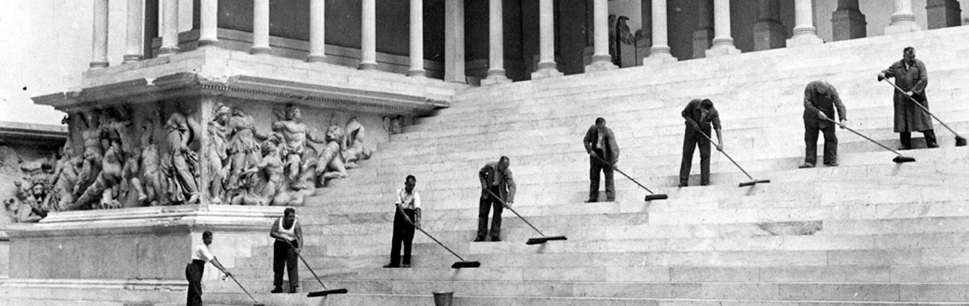 Das Foto wirkt auf den ersten Blick unspektakulär: Männer stehen auf den breiten Stufen eines monumentalen Gebäudes und fegen Stein um Stein. Keine Waffen, keine Fahnen, keine dramatischen Gesten. Und doch erzählt dieses Bild mehr über das Ende des Zweiten Weltkriegs als viele Aufnahmen von Schlachten oder Ruinen. Es zeigt einen Moment des Übergangs – zwischen Zerstörung und Hoffnung, zwischen Vergangenheit und Zukunft.