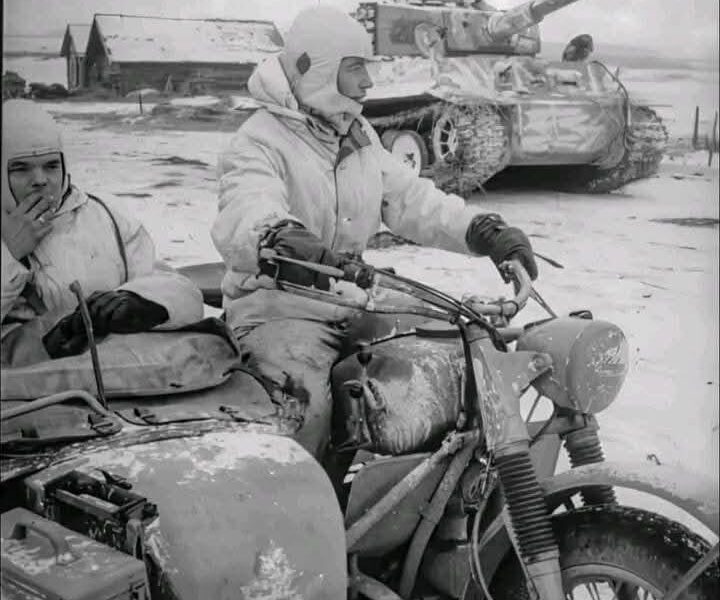 Hinter den Motorradfahrern sieht man einen schweren Panzer, vermutlich einen Tiger I oder Panther. Diese Stahlgiganten waren die Machtinstrumente ihrer Zeit – aber auch sie litten unter der Kälte. Öl verfestigte sich, Ketten froren ein, und selbst erfahrene Mechaniker mussten stundenlang arbeiten, um sie wieder kampfbereit zu machen. Die Männer auf dem Panzer trugen dicke Mäntel und Handschuhe, doch die metallische Kälte kroch durch jede Schicht.