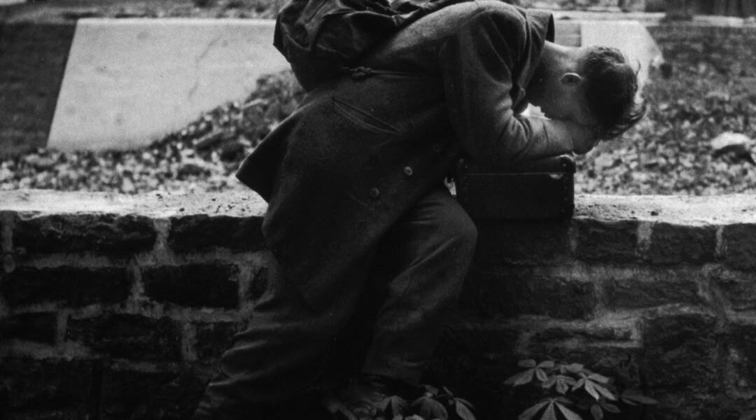 Das Foto vermittelt eine Mischung aus individueller und kollektiver Tragik. Der Mann an der Mauer wirkt allein, obwohl er Teil einer Masse von Millionen Schicksalen ist. Sein Körperhaltung – erschöpft, fast zusammengekauert – spiegelt den Zustand einer ganzen Generation wider, die vom Krieg gezeichnet war. Die Ziegelmauer, an die er sich lehnt, könnte als Symbol für eine zerstörte Heimat gelesen werden: hart, kalt und brüchig.