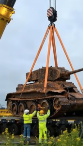 Die Bergung begann am frühen Nachmittag unter strömendem Regen, der die Arbeit deutlich erschwerte. Ein riesiger Mobilkran aus Białystok wurde herangeschafft und mit schweren Spanngurten ausgestattet, die wie orangefarbene Arme über das meterdicke Erdreich gelegt wurden. Als die Gurte schließlich unter dem Panzer durchgezogen und befestigt waren, hielt die Menge den Atem an. Die ersten Zentimeter hoben sich, dann ein Ruck – und plötzlich löste sich der geschichtsträchtige Stahlkoloss aus seinem 80 Jahre alten Grab.