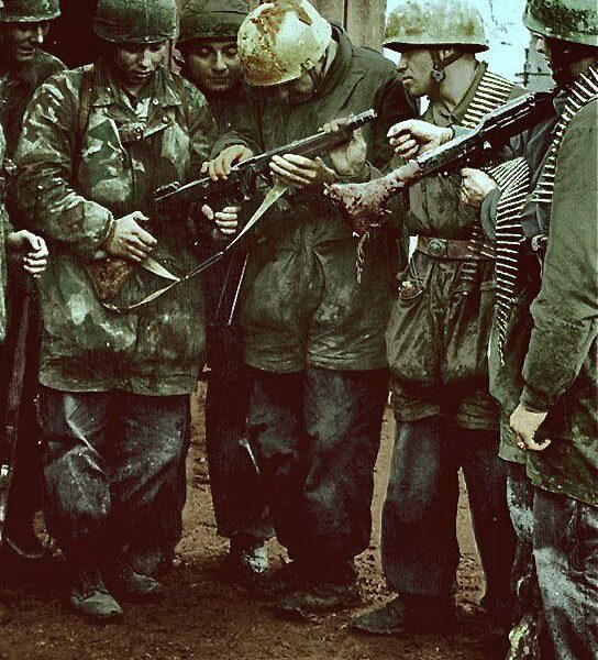 In the photo : German paratroopers examine a Thompson submachine gun during the Battle of Normandy (1944). Of the seven paratroopers, two are carrying ammunition and an MG-42 around their necks.