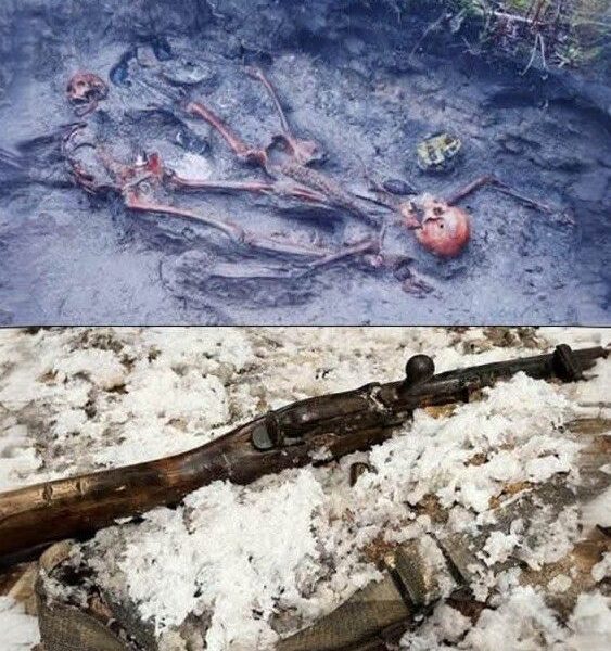 Besonders verstörend war der Zustand einiger Gegenstände, die neben den Knochen lagen: eine Feldflasche mit noch hörbarem Wasserrest im Inneren, ein halb erhaltener Soldbuch-Einband, ein Taschenmesser, dessen Klinge nach 80 Jahren immer noch einrastete. Und schließlich die Waffe, die für die Sucher beinahe symbolisch wurde – ein Kar98k, eingefroren im Schnee, als hätten die Hände, die es hielten, sich gerade erst gelöst. Selbst die Gewehrriemen blieben stellenweise erkennbar.