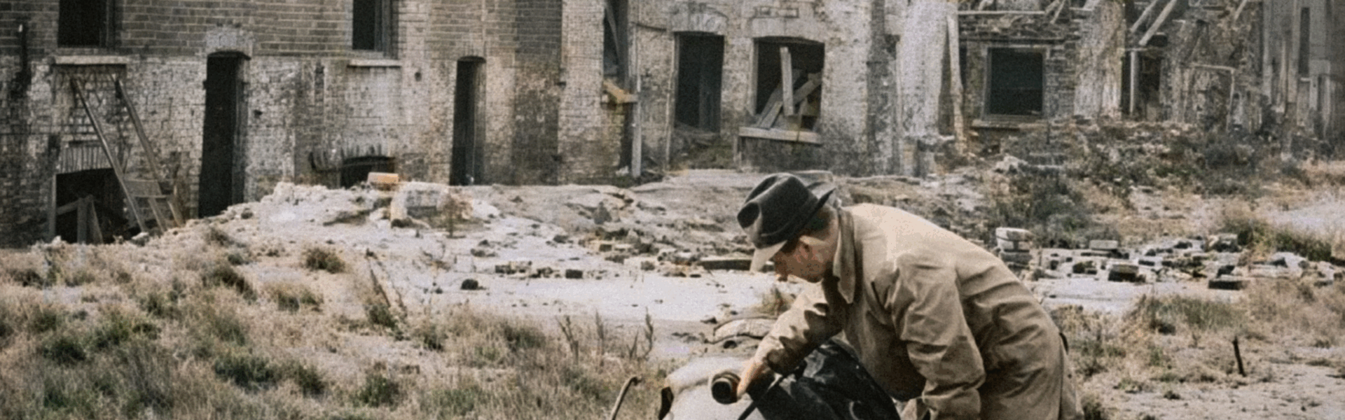 Gleichzeitig zeigt das Bild auch eine völlig andere Seite der Geschichte: die Landschaft der Zerstörung, in der diese hochmoderne Technologie plötzlich auftaucht. Die zerfallenen Häuser im Hintergrund, die offenen Dächer und eingestürzten Wände vermitteln ein Bild des Krieges, das viele Menschen damals aus ihrem Alltag kannten. Es ist eine eigenartige Gegenüberstellung – auf der einen Seite die technologische Avantgarde des Raketenzeitalters, auf der anderen Seite die zerbombten Überreste städtischer Wohnviertel.