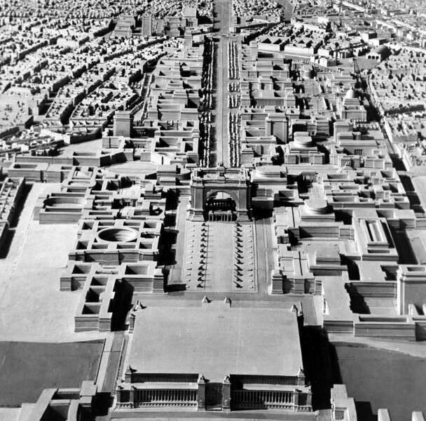 Ein weiteres Kernstück war eine monumentale Nord-Süd-Achse, mehrere Kilometer lang und deutlich breiter als jede bestehende Berliner Straße. Sie sollte Triumphbögen, Verwaltungsbauten, Ministerien und Repräsentationsgebäude miteinander verbinden.
