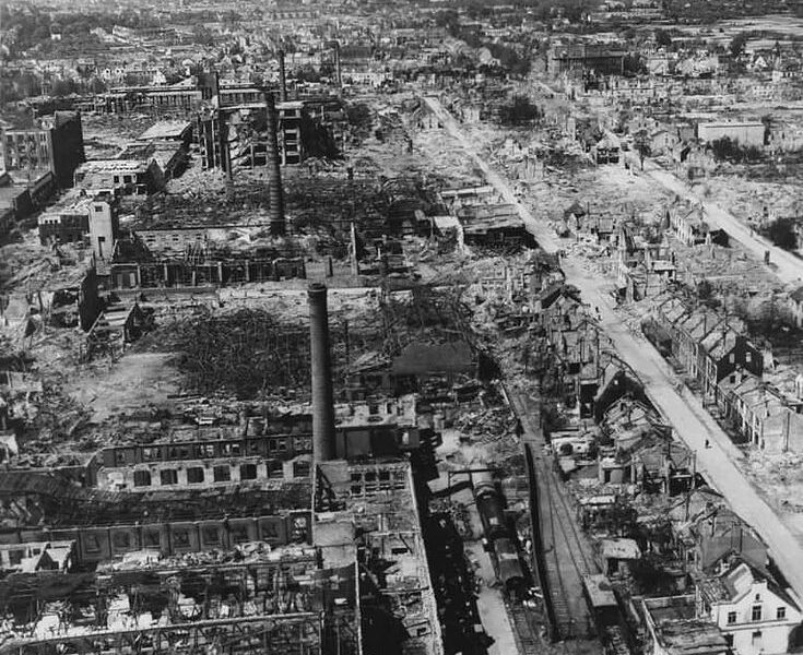 Die Aufnahme von 1945 zeigt das Resultat dieser Strategie. Was einst Wohnhäuser, Schulen, Geschäfte und Plätze waren, ist nun ein Meer aus Ruinen. Man erkennt Straßenverläufe nur noch anhand der Trümmerlinien. Von der Luft aus wirken die Steinfundamente wie Narben im Stadtbild – stumme Zeugen der Gewalt, die sich über Jahre angesammelt hatte.