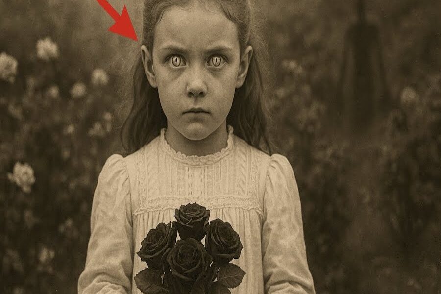 It stood directly behind Elellanor, one long-fingered hand extended toward the child’s head, just inches from touching her, but frozen in the moment before contact. The child, smiling solemnly at the camera, seemed completely unaware of the presence behind her.